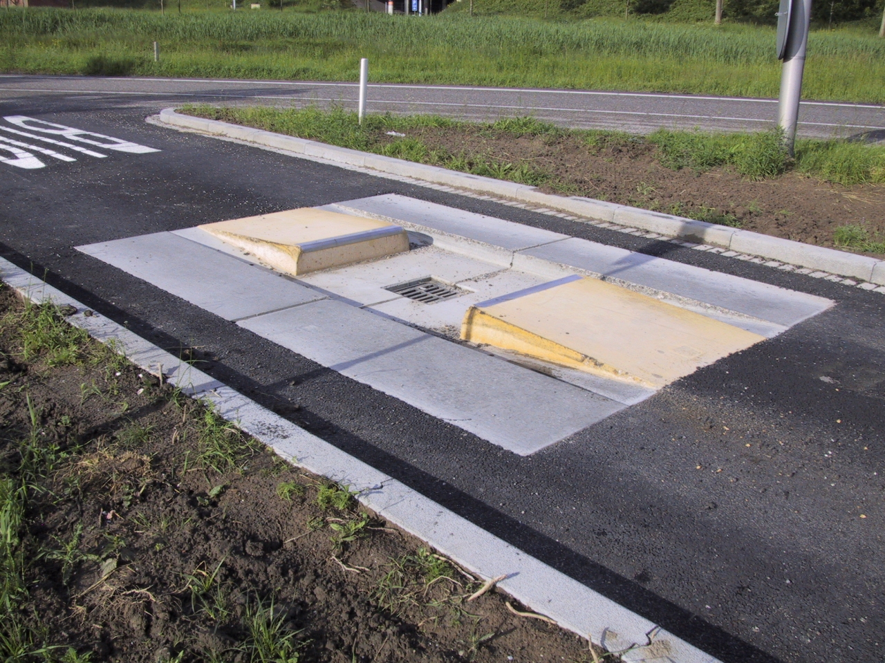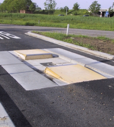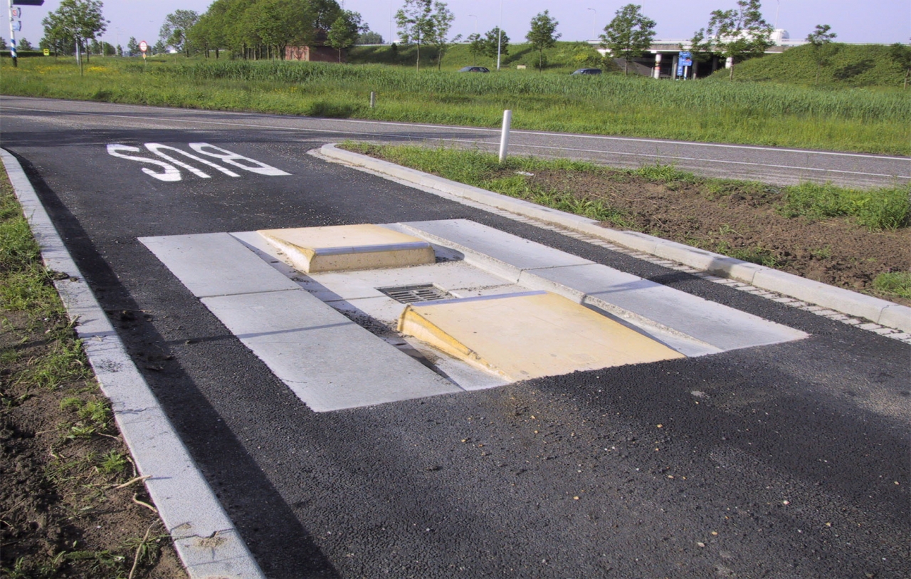 Op steeds meer plaatsen in Nederland krijgt het openbaar vervoer vrij baan en worden personenauto's via andere wegen geleid. Een goede manier om deze scheiding te maken is onderstaande prefab bussluis, waarbij een personenauto deze 'hindernis' niet schadevrij kan passeren terwijl een bus hier probleemloos doorrijdt.