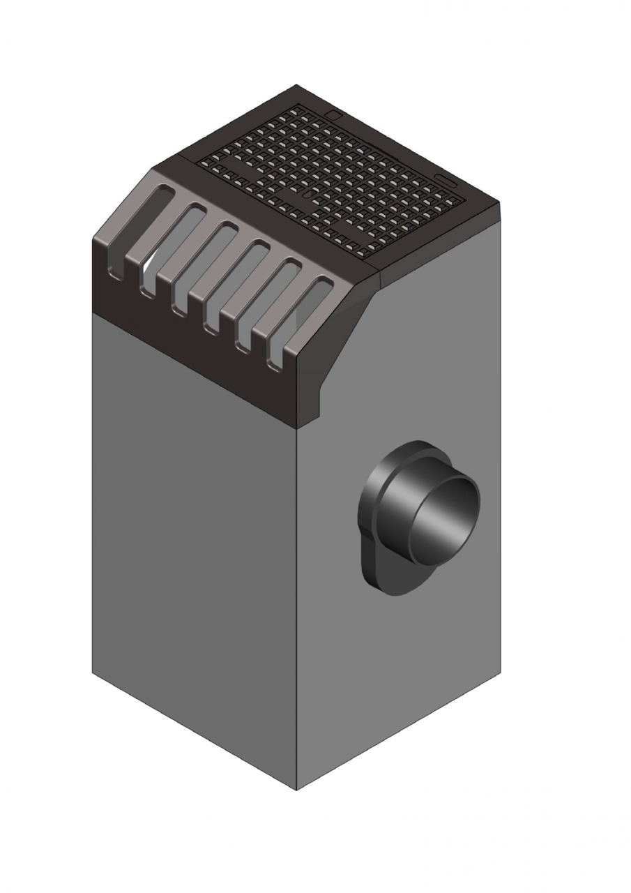 Eendelige trottoirkolk beton/gietijzer, type TRK 2030, aansluitend op geleidebandprofiel 7/20 met U-vormige omranding verankerd aan het beton d.m.v. beugels, deksel, afgeronde inlaatopeningen, alsmede een ingestort stankscherminbouwgarnituur met stootnokken en aangevulcaniseerde rubbermanchet voor inwendige flexibele aansluiting van PVC-buis diam. 125 / 160 mm. Stankscherm op twee punten scharnierend terugliggend in de wand.