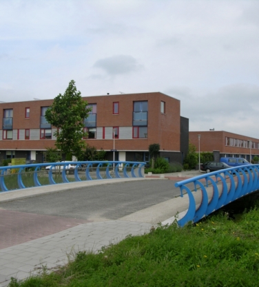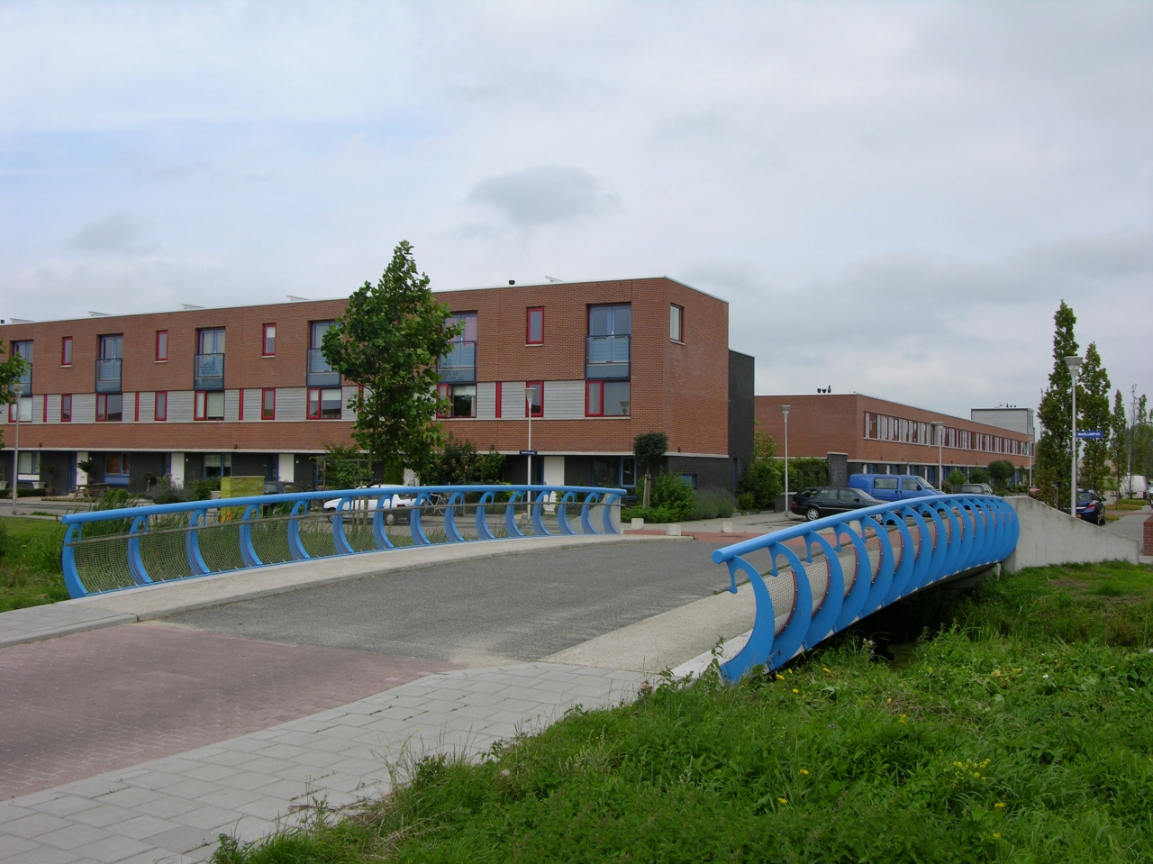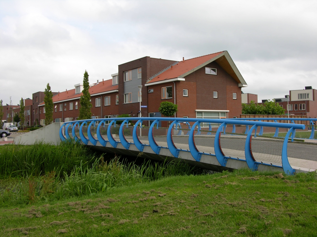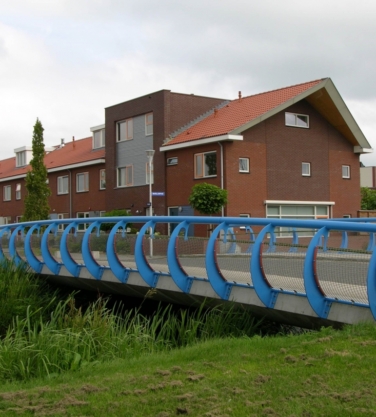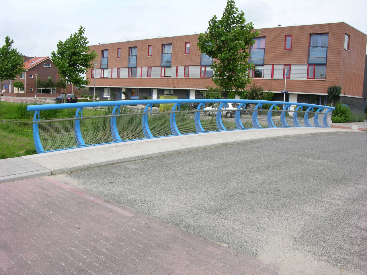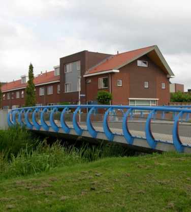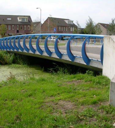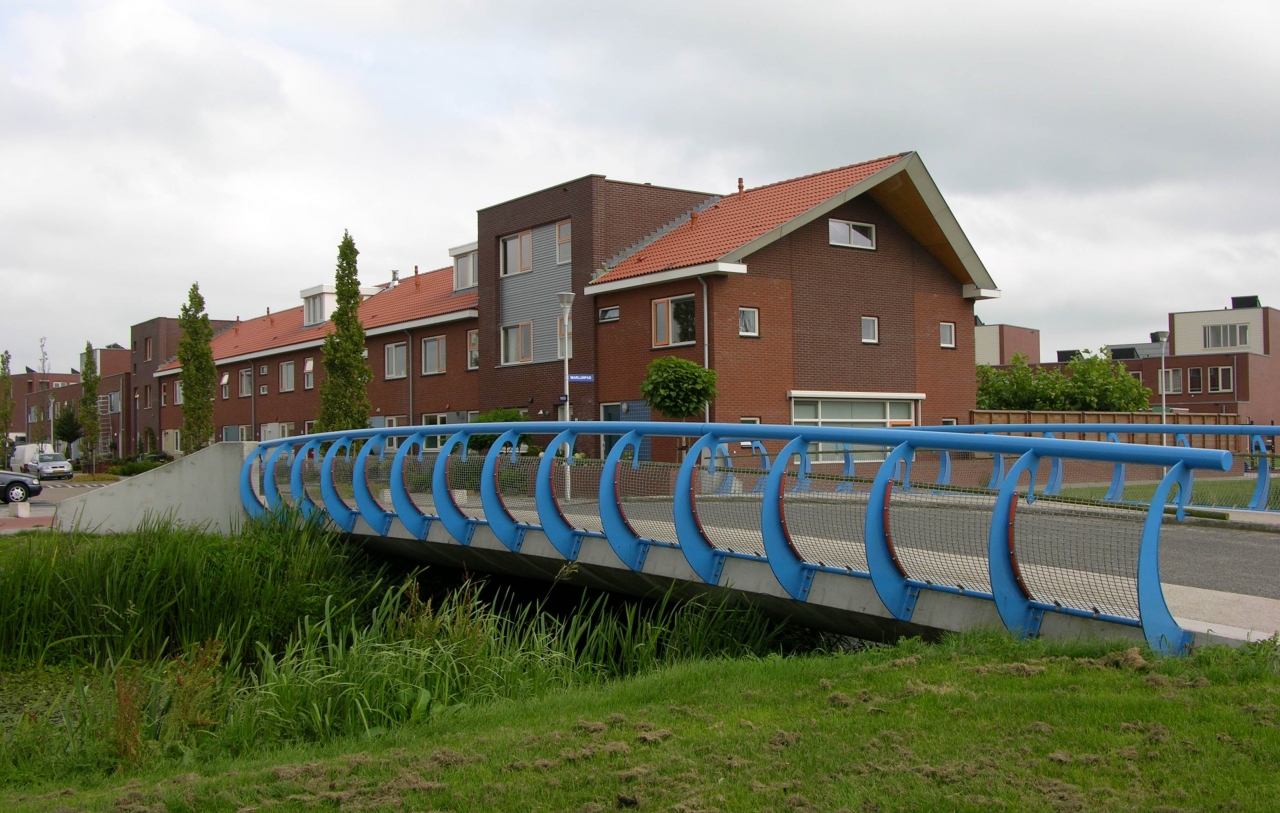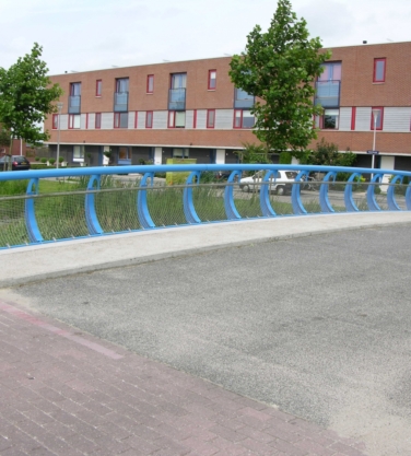 De leuning type Oudewater kenmerkt zich door het van buiten naar binnen buigen van de slanke stijlen. Doordat de stijlen eerst naar buiten buigen komt de bovenregel niet over het brugdek. Een stalen net zorgt voor de veiligheid van de kinderen.