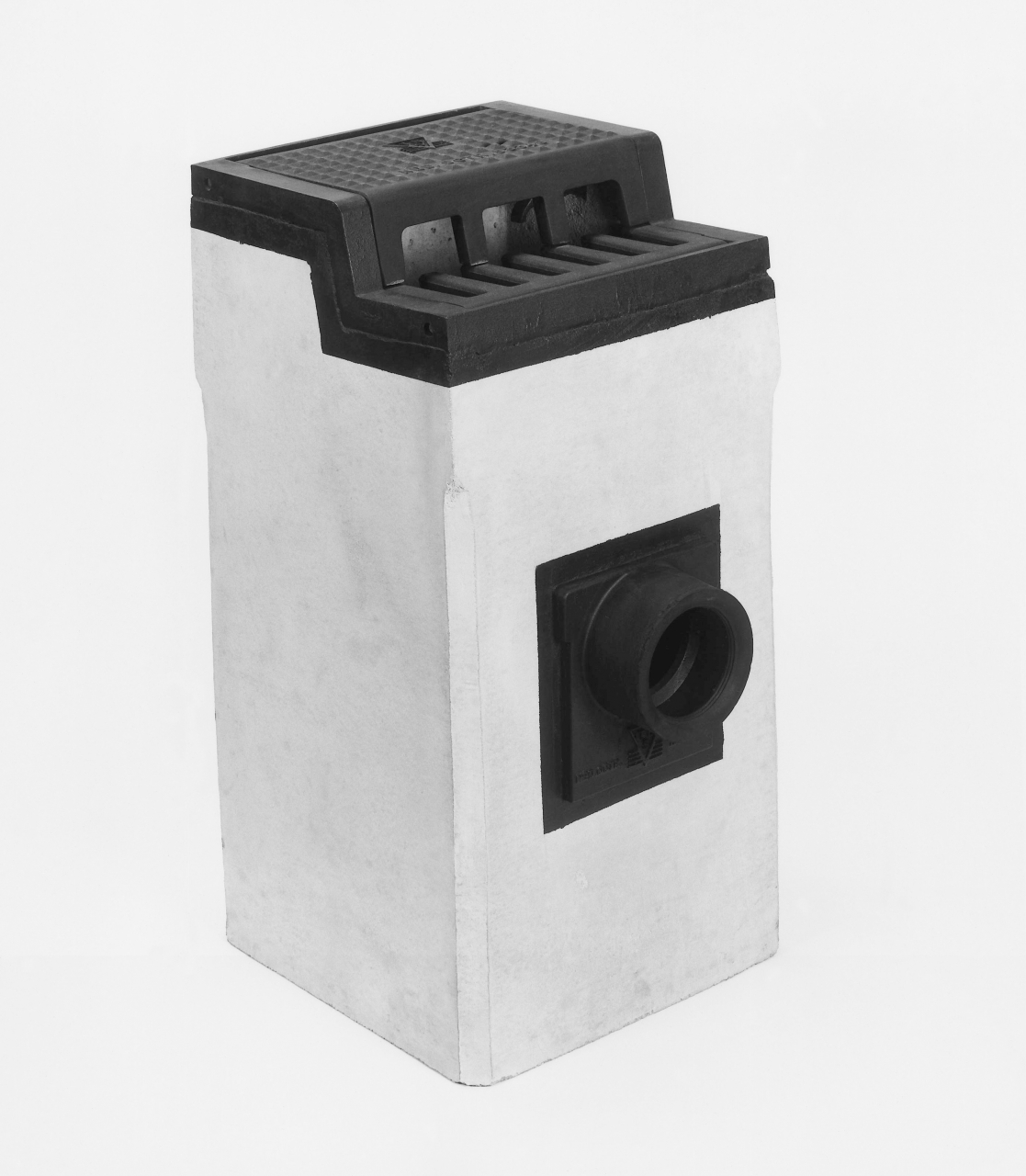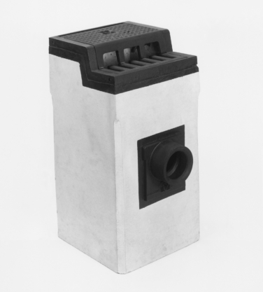 Eendelige combinatiekolk beton/gietijzer, type STC 100, bandhoogte 100 mm, met U-vormige omranding verankerd aan het beton d.m.v. beugels, scharnierend deksel met valhaak, rooster, afgeronde inlaatopeningen, alsmede een ingestort stankscherminbouwgarnituur met stootnokken en aangevulcaniseerde rubbermanchet voor inwendige flexibele aansluiting van PVC-buis diam. 125 / 160 mm. Stankscherm op twee punten scharnierend terugliggend in de wand.