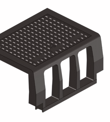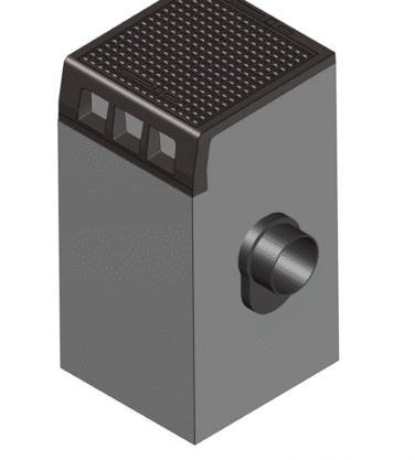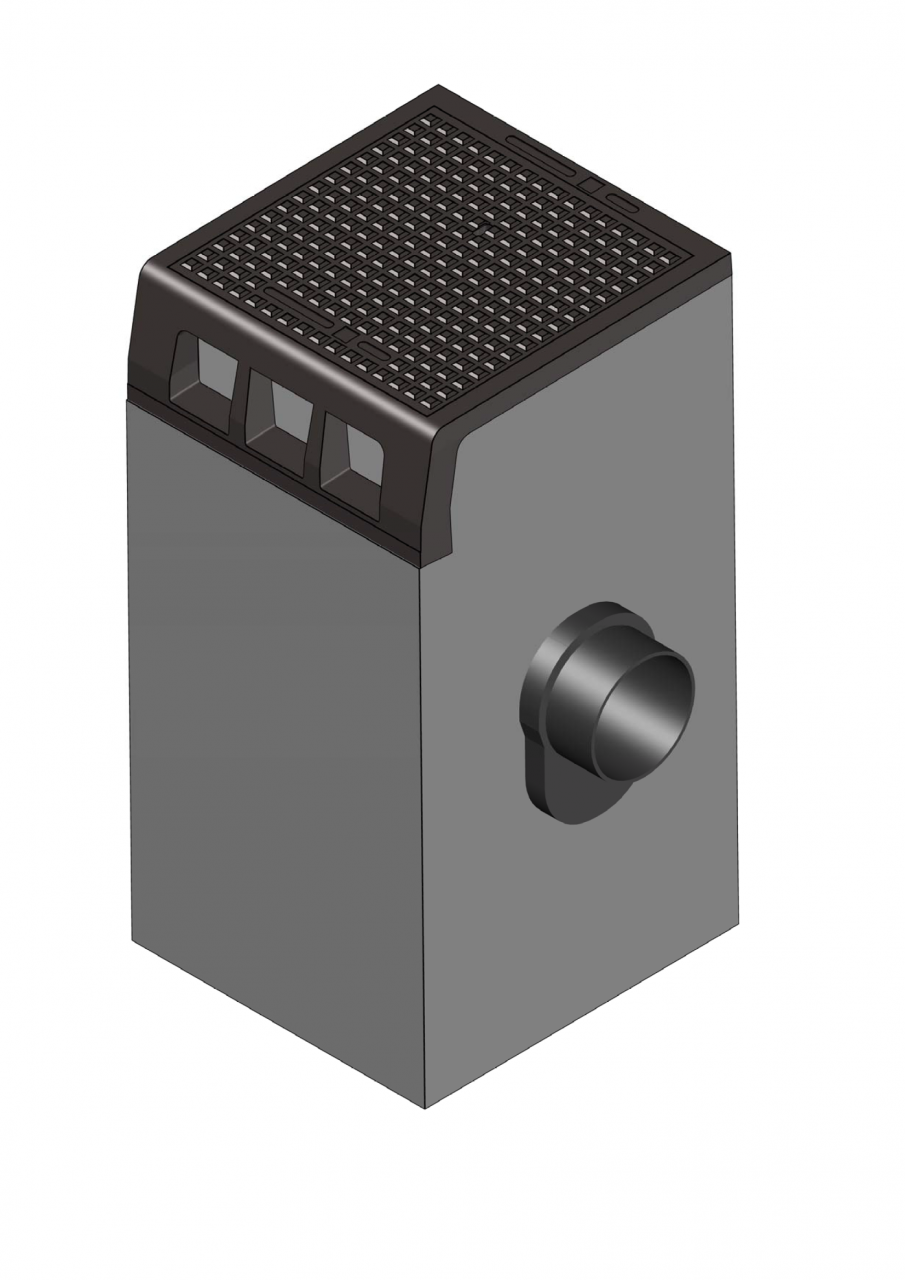 Eendelige trottoirkolk beton/gietijzer, type TRK 4715, met U-vormige omranding verankerd aan het beton d.m.v. beugels, deksel met valhaak, teruggeplaatste afgeronde inlaatopeningen, alsmede een ingestort stankscherminbouwgarnituur met stootnokken en aangevulcaniseerde rubbermanchet voor inwendige flexibele aansluiting van PVC-buis diam. 125 / 160 mm. Stankscherm op twee punten scharnierend terugliggend in de wand.