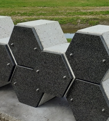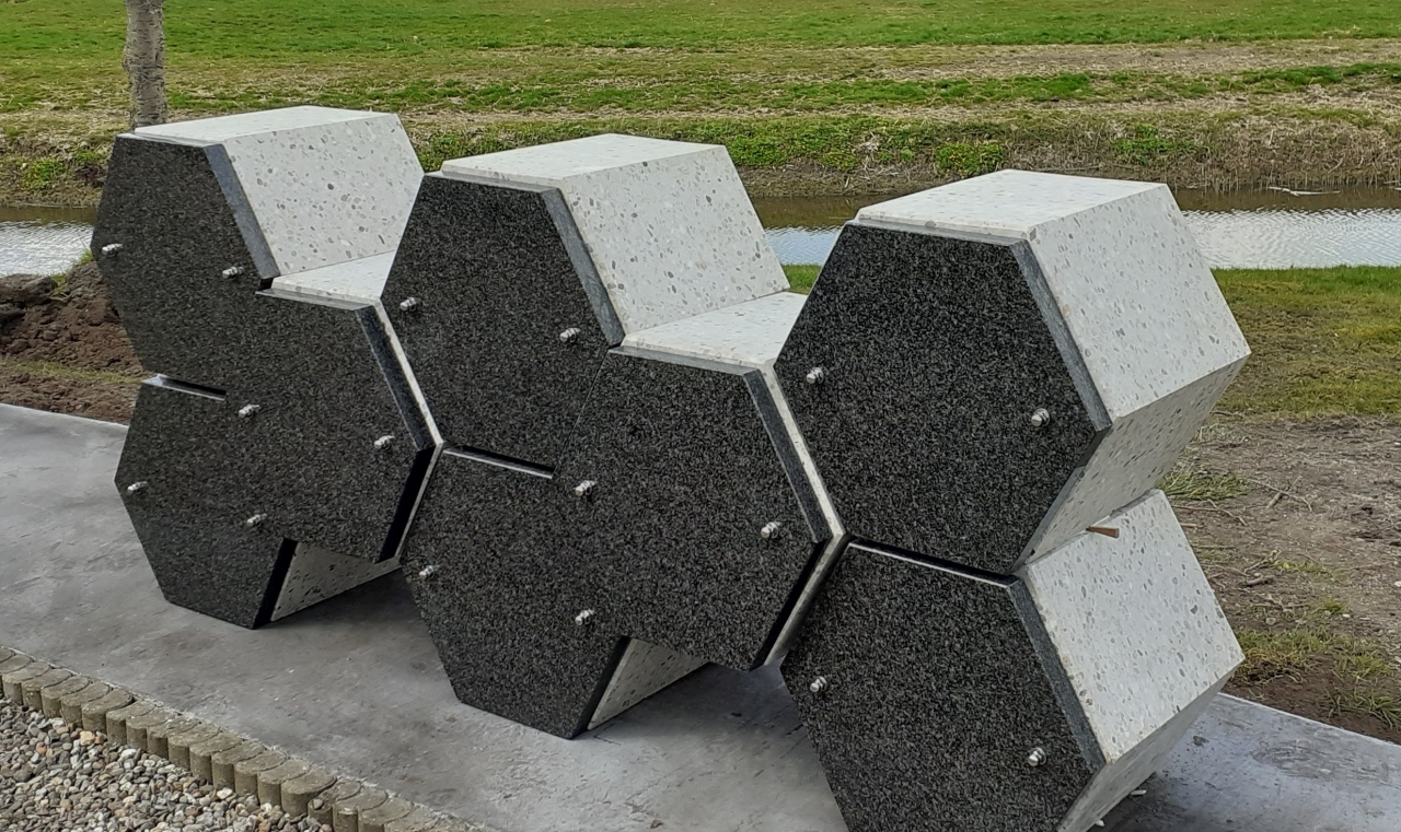 De zeskantige bakjes kunnen zowel in grijs als in kleur uitgevoerd worden met indien gewenst een oppervlakte-